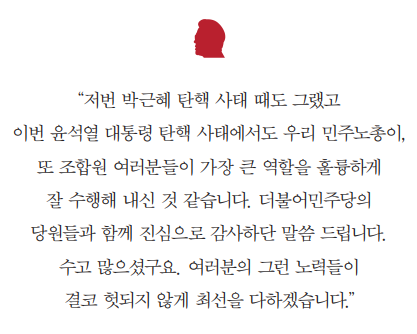 증오와 분열을 이용하지 말고 정치보복을 끊어야 한다는 말이 왜 망언인지 알 수가 없어요. 민주노총이 윤석열 대통령 탄핵 사태에서 역할을 한 게 잘못일까요~? 정말 권선동 의원에게 너무 고맙다는 말을 해야 할 것 같아요.