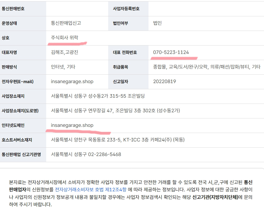 상호명이 주식회사 위락이죠? 위락이 이 쇼핑몰 운영업자에요. 대표 전화번호 070-5223-1124로 되어 있는 거 보이시죠? ㅋㅋ 찾았습니다. 인터넷도메인도 확인 되고~