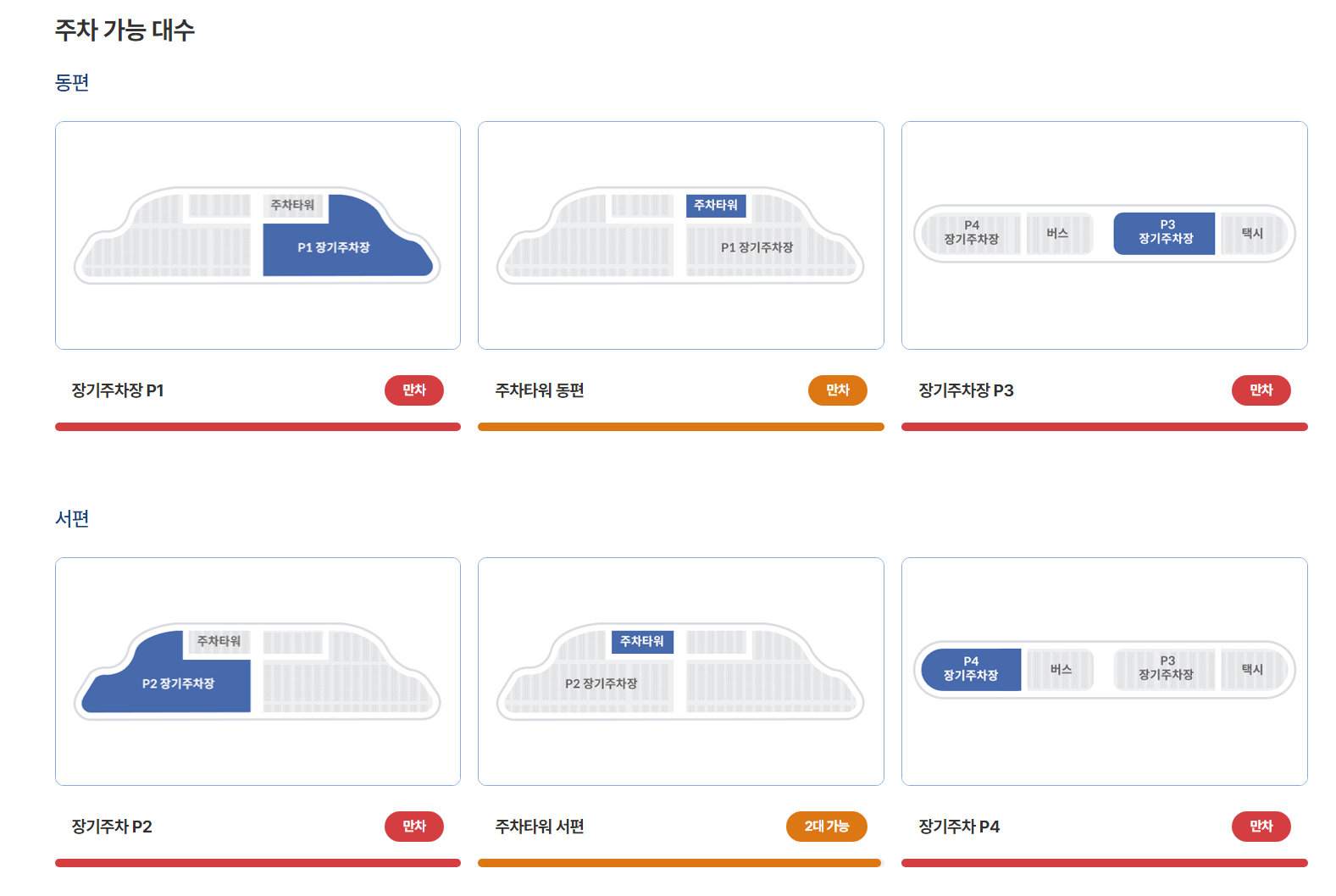 현재 기준으로는 인천공항 주차장이 모두 만차에요. 주황색으로 표시된 곳들도 2대씩 비어있을 뿐입니다. 이런 연휴 같은 날에는 거의 뭐.. 이런 날에 인천공항 주차장에 대한 정보 없이 바로 갔다가 주차장에서 입장이 안 되는 바람에 입국 심사도 못하고 티켓 날립니다..! 조심해야해요.. 특히 해외여행은 진짜 ㅋㅋ 이런 날에는 독입니다.