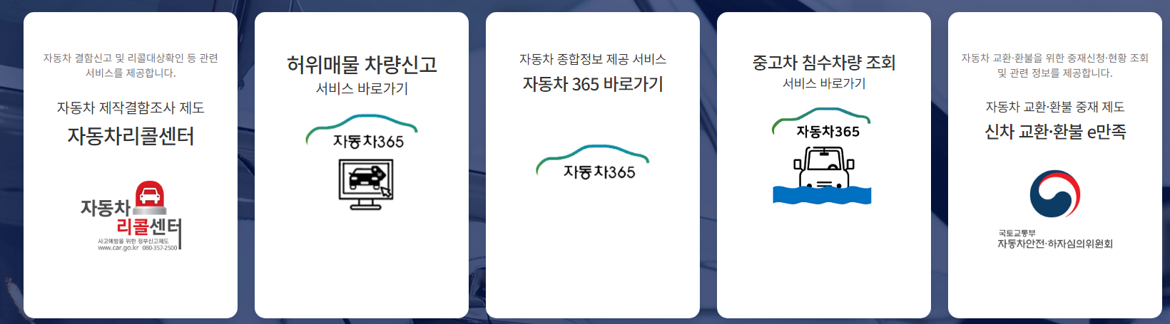 자동차365에서는 아래와 같은 서비스를 이용할 수 있어요. 중고차 침수차량까지 조회할 수 있고 자동차 교환이나 환불, 중재 제도에 타인차량 조회까지 할 수 있죠! 그럼 본격적으로 어떤 서비스가 가능한지 본문에서 알아볼게요.