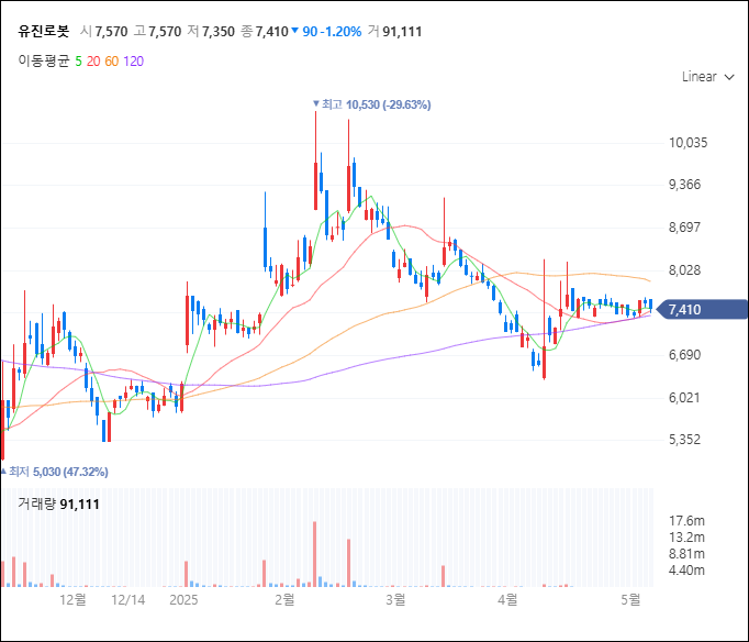 직접 투자해본 경험상 유진로봇은 단기 이벤트보다는 ‘테마 흐름’을 타는 경우가 많아서, 보안 및 순찰로봇 도입이 본격화되면 한 번쯤은 강한 반등 흐름이 나올 가능성이 있다고 봐요.
