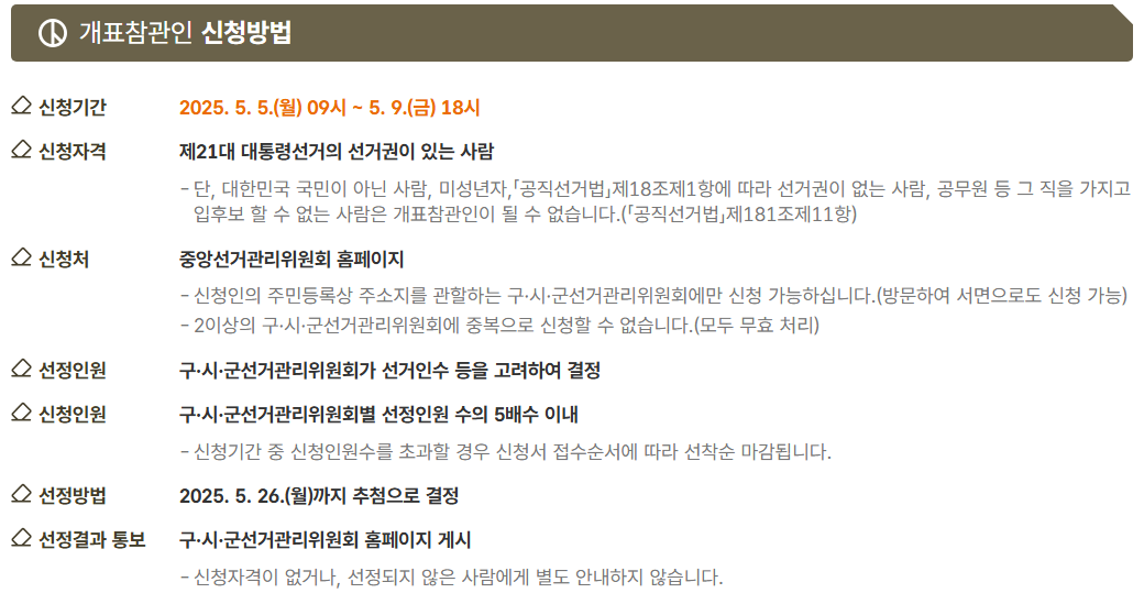 선정 방법은 추첨이며, 2025년 5월 26일(월)까지 선관위 홈페이지에 결과가 게시됩니다. 선정되지 않은 사람에게는 따로 통보되지 않아요. 이 신청은 선착순 마감이라.. 이 글을 쓰고 있을 때는 이미 마감되었더라구요. 혹시 취소자가 나올 수 있으니 시도해보세요 ^^