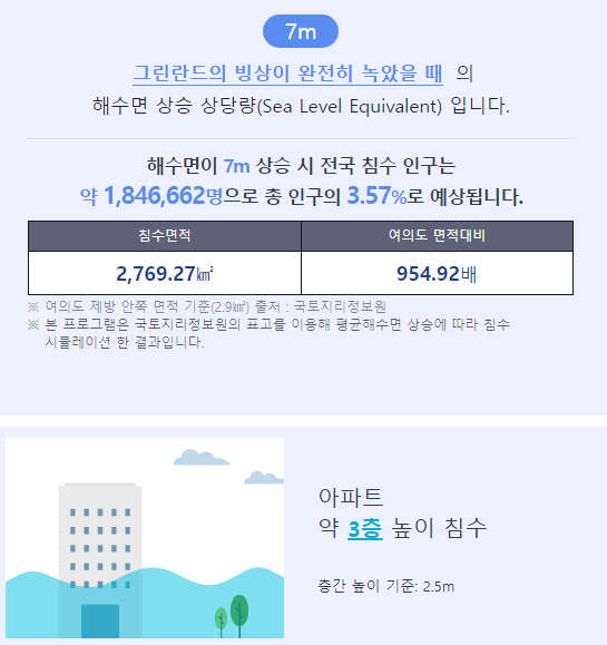 말로만 들으면 잘 와닿지 않은 느낌인데, 해수면이 7m만 올라와도 엄청난 피해가 예상됩니다. 우리 세대는 그럭저럭 먹고 살 수 있다 하더라도 우리의 자식 세대, 자식이 자식 세대는 서울 한강을 강이 아닌 바다로 부르게 될 가능성도 있겠습니다. 해수면이 상승하면 강물이 바닷물이 되어버리니까요.