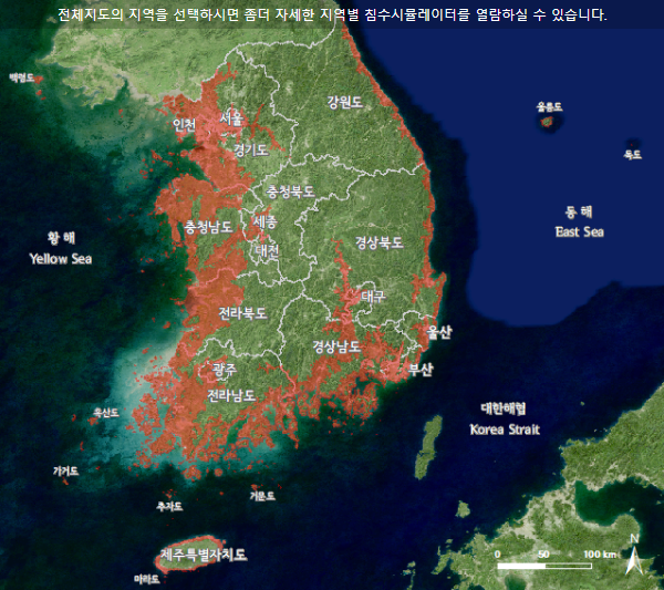 서울, 수도권이 아닌 전국으로 확대해보면 더 피해가 심각해집니다. 지구온난화 해수면 상승이 7m만 되도 서해안의 거의 대부분이물에 잠기게 되며 특히 충청남도 지역과 전라남도 지역의 피해가 심각해지게 됩니다. 가거도 등 섬들은 거의다 물에 잠기게 되며 농업지대의 피해가 심각해집니다.