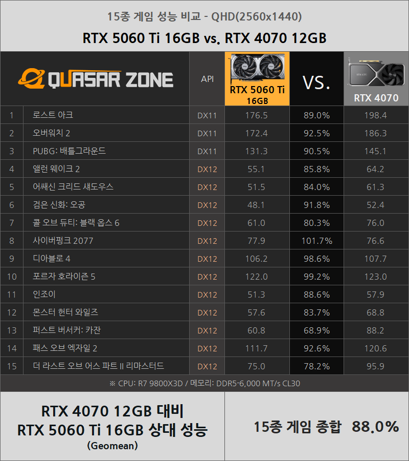 - RTX 5060 Ti 16GB는 RTX 4070보다 QHD 해상도 기준 12% 낮은 성능