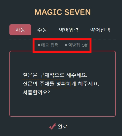메모에 질문을 구체적이고 명확하게 입력하고, 충분히 생각한 뒤 완료를 눌러주세요.