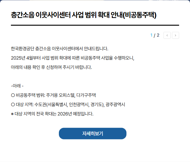층간소음 이웃사이센터는 공동주택에 거주하는 사람만 신청할 수 있어요. 한 마디로 아파트나 다세대주택에 사는 사람만 신청 가능하다는 거예요. 다만! 25년 4월부터 수도권 및 광주광역시는 비공동주택도 신청이 가능하게 되었어요!