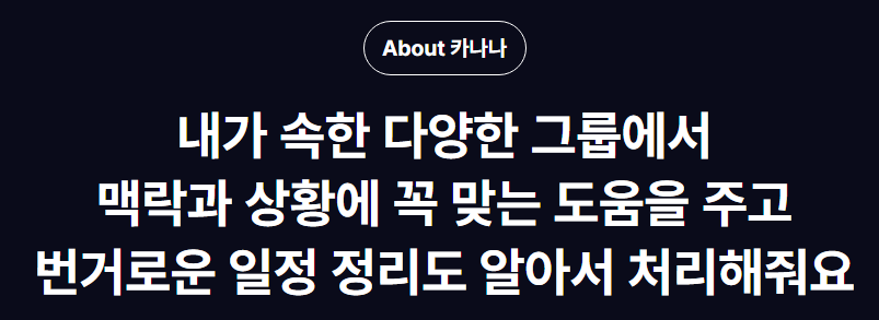 카나나AI는 두 가지 주요 캐릭터인 카나와 나나를 통해 기능이 나뉩니다. 카나는 그룹 챗봇으로서, 여러 사람과 함께 쓰며 일정 조율이나 역할 분담을 돕고, 나나는 개인 맞춤형 챗봇으로, 할 일 관리와 리마인드를 책임집니다. 두 캐릭터 모두 대화를 기억하고, 상황에 맞춰 진화하는 지능형 메이트입니다.