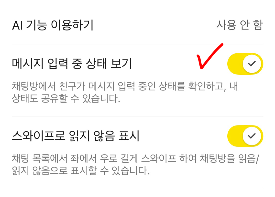 5. ‘메시지 입력 중 상태 보기’ 항목 OFF로 전환