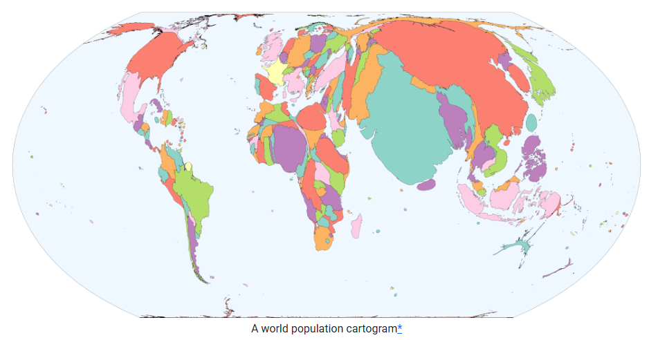 지도 위에 데이터를 시각화하는 방법 중 가장 인상 깊은 방식, 바로 카토그램(Cartogram)입니다. 일반적인 지도는 면적 그대로 정보를 보여주지만, 카토그램은 데이터를 기준으로 지도 영역을 왜곡시켜 보여주기 때문에 어떤 나라가 더 크고 작게 보이는지를 통해 한눈에 ‘데이터의 크기’를 파악할 수 있어요.