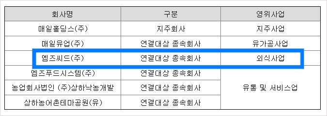 매일그룹은 '매일홀딩스'가 지주사입니다. 이 매일홀딩스의 자회사를 보면 엠즈씨드가 보이죠? 엠즈씨드는 우리에게 익숙한 카페인 '폴바셋'을 운영하는 기업입니다. 즉, 폴바셋은 매일홀딩스의 그룹사인거죠.