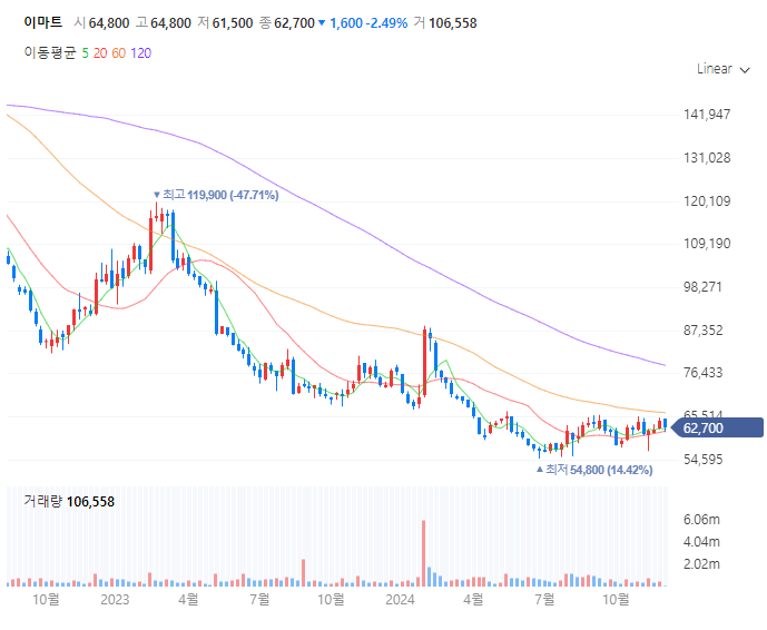 이마트는 스타벅스를 가지고 있지만, 스타벅스 브랜드를 아주 개떡같이 운영하기로 유명한 기업입니다. 저 유명한 스타벅스를 왜 이따구로 운영하는지 도통 알 수가 없는 기업이죠. 주가만 봐도 답이 나옵니다. 추천하고 싶지 않습니다.
