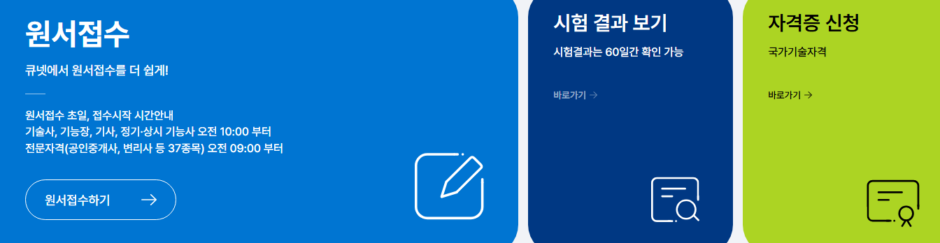 위 버튼을 누르면 Q-Net 국가자격증 홈페이지에 바로 연결됩니다. 검색에도 잘 나오지 않는 홈페이지를 소개하고자 이 글을 쓰는데요, 허위 사실을 적는 사람들이 많기 때문에 이 블로그를 통해서 접속하시는게 안전할거에요. 국가자격시험 일정 확인, 원서 접수 및 합격 여부 확인까지 한 번에 가능한 공식 포털입니다.