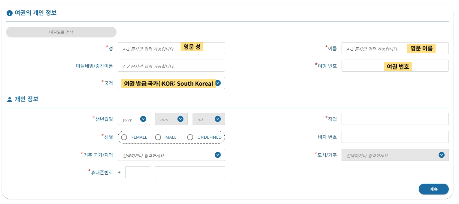 여권 정보를 정확히 입력하세요. 이름은 대문자 영어 기준으로 입력하고, 생년월일, 직업, 휴대폰번호 등도 빠짐없이 입력합니다. 도시명은 영문 앞 세 글자만 입력하면 쉽게 선택할 수 있어요. (예: SEO = 서울, BKK = 방콕)