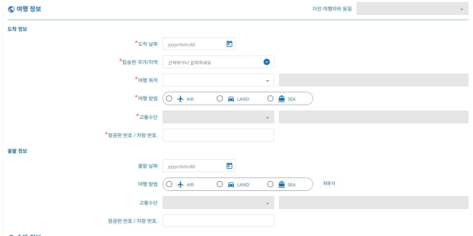 - 작성 가능 시점: 입국일 기준 3일 전부터 (예: 5월 4일 입국이면 5월 1일부터 작성 가능)