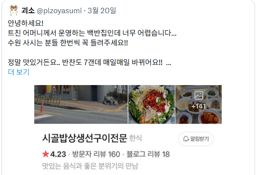 요즘 SNS를 보면 부모님의 가게를 대신 홍보하는 자녀들의 사연이 심심치 않게 보이곤 합니다. 대부분 “장사가 잘 안 된다”, “하루 매출이 없을 지경”이라는 이야기인데요. 이 중 한 글이 수천만 뷰를 넘기며 화제가 됐고, 실제로 많은 사람들이 그 가게를 방문하는 모습으로 이어졌다고 해요. 어떤 분은 아예 지도로 정리했다고 하더라고요?