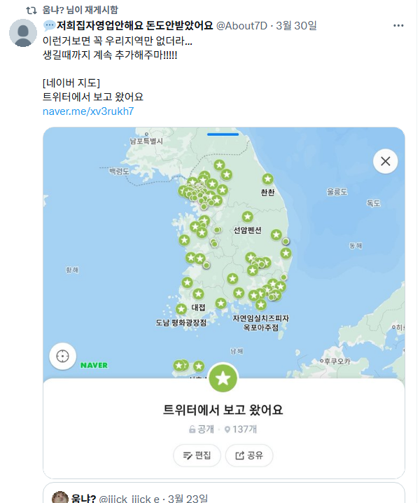 어떤 네티즌은 SNS에서 공유된 가게 정보들을 모아 ‘자영업자 구조 지도’라는 이름으로 네이버 지도에 등록했어요. 현재 500곳이 넘는 매장이 포함되어 있고, 지역별로 가까운 가게를 쉽게 찾을 수 있답니다. 직접 방문하거나 배달로도 응원할 수 있어요.