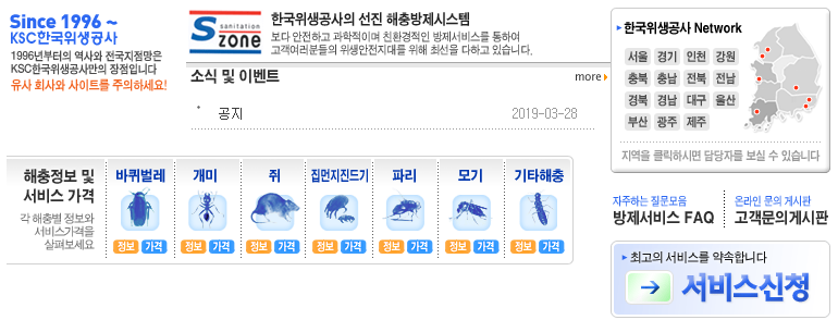 위 버튼을 누르면 한국위생공사 홈페이지에 바로 연결됩니다. 검색에도 잘 나오지 않는 홈페이지를 소개하고자 이 글을 쓰는데요, 허위 사실을 적는 사람들이 많기 때문에 이 블로그를 통해서 접속하시는게 안전할거에요. 해충방제, 소독, 청소 등 위생관리 전문업체로 정확한 서비스와 견적을 확인할 수 있습니다.