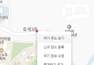 - 그 위치를 한 번 더 길게 누르기 또는 터치하면 말풍선에 정확한 도로명/지번 주소 표시
