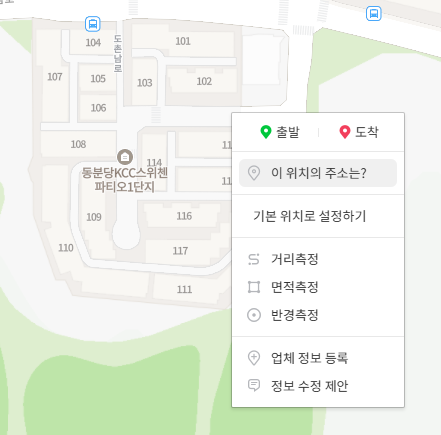 - 그 위치를 한 번 더 길게 누르기 또는 터치하면 말풍선에 정확한 도로명/지번 주소 표시
