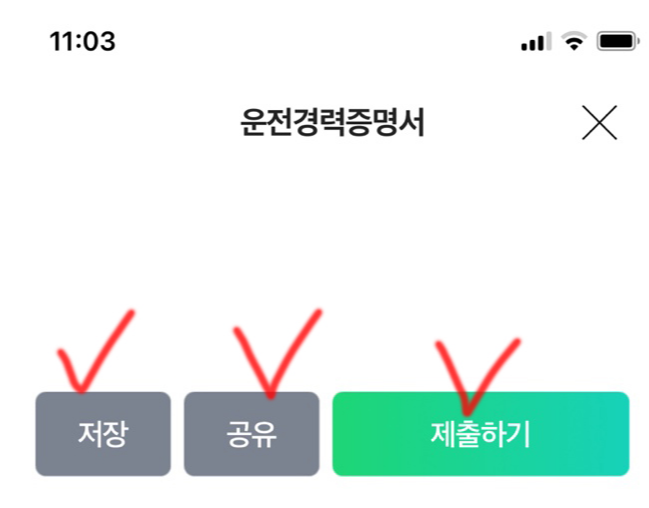 7. 운전경력증명서가 발급되면 저장하거나 공유하거나 제출하기를 눌러서 이용하면 됩니다.