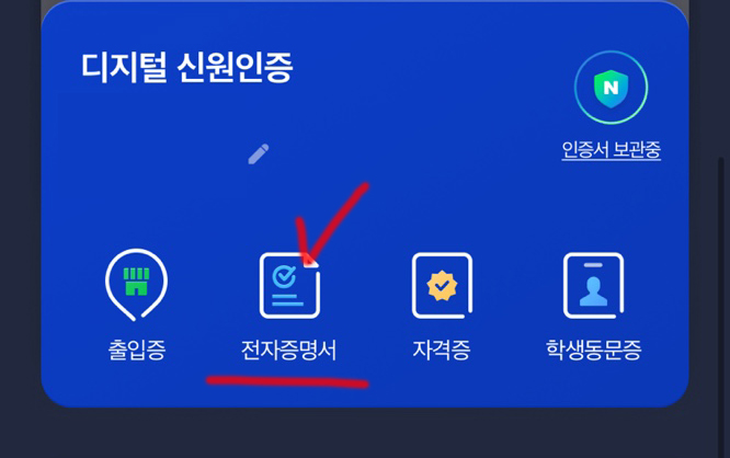 2) 그럼 파란색 디지털신원인증이라는 부분이 나오죠? 여기서 전자증명서를 눌러주세요.