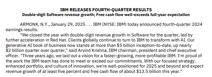 이상으로 2024년도 4분기 IBM 실적발표 내용과 함께 실적발표와 관련한 시각들, 25년 전망까지 살펴봤어요. 모두 좋은 하루 되세요^^