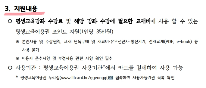 경기도에 거주하는 저소득층 성인(19세 이상)을 대상으로, 평생교육 강좌를 들을 수 있도록 수강료와 교재비를 지원하는 제도예요. 1인당 35만원의 포인트가 지급되고, 이 포인트로 등록된 기관의 강좌를 들을 수 있어요.