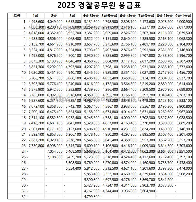 2025년이 됐습니다. 해가 바뀌면 공무원이고 경찰이고 소방관이고 모두 호봉이 올라가죠. 호봉제를 택하고 있는 모든 직장이 그렇습니다. 그럼 가장 궁금한게 내 호봉이 올라갔을 때 월급이 얼마인지겠죠? 그래서 제가 2025년 경찰공무원 봉급표를 보기 쉽게 정리했습니다. 거두절미하고 바로 보시죠.