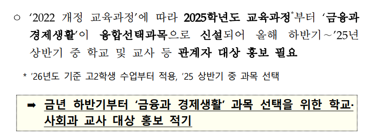 고등학교 교육 변화는 대학입시 때문이라도 민감한 주제인데요, 2025년부터 고등학교 교육 중에 변화되는 점이 있다면 금융 교육이 크게 확대된다는 점이에요. 아주 환영할만한 일이죠. 한국에서 경제 초보는 없어져야 하니까요. 이 금융교육은 금융위원회가 주도해서 낸 정책이에요.