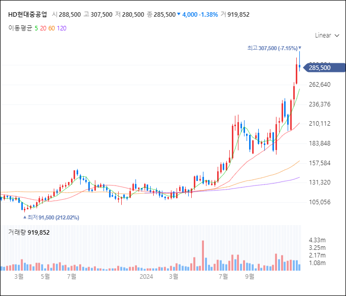 고환율 말고도 개별적인 호재도 있어요. 인도에서 러브콜을 받았다고 해서 HD현대중공업 주가가 최근 크게 올랐죠. 상장 이후 최고가라고 해요. 조선업계는 사업계획을 짤 때 보수적으로 환율을 산정하는데, 이번 계엄령 사태 이후로 2024년 연간 이익은 컨센서스를 훨씬 상회할 것으로 예상된다네요.