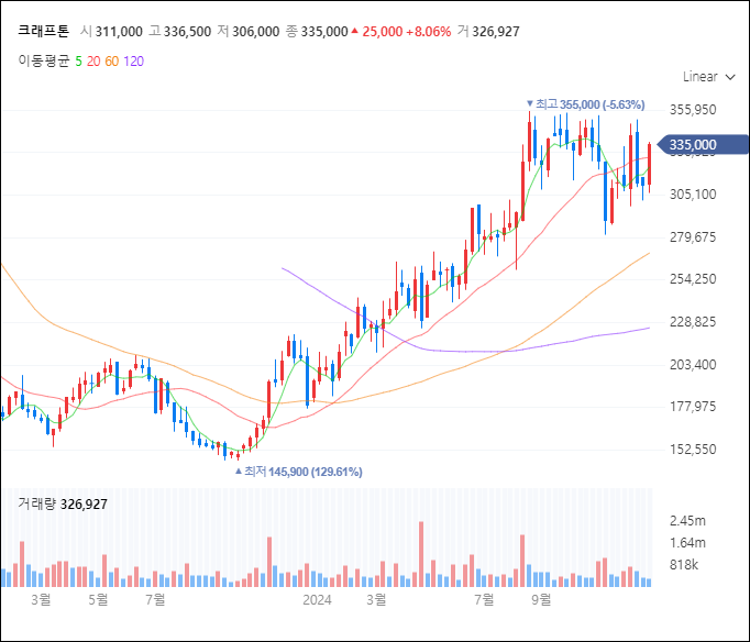 한 마디로 달러 버는 괴물이라는 거죠. 배그를 해본 사람은 알겠지만 크래프톤의 모든 결제는 달러로 이루어져요. 크래프톤 자체가 고환율 관련주 TOP3에 들만 한다는거죠. 이런 이유로 코스피가 개박살이 나고 있는 와중에 크래프톤은 나홀로 버텨내고 있어요. 주가를 봐도 알겠죠?