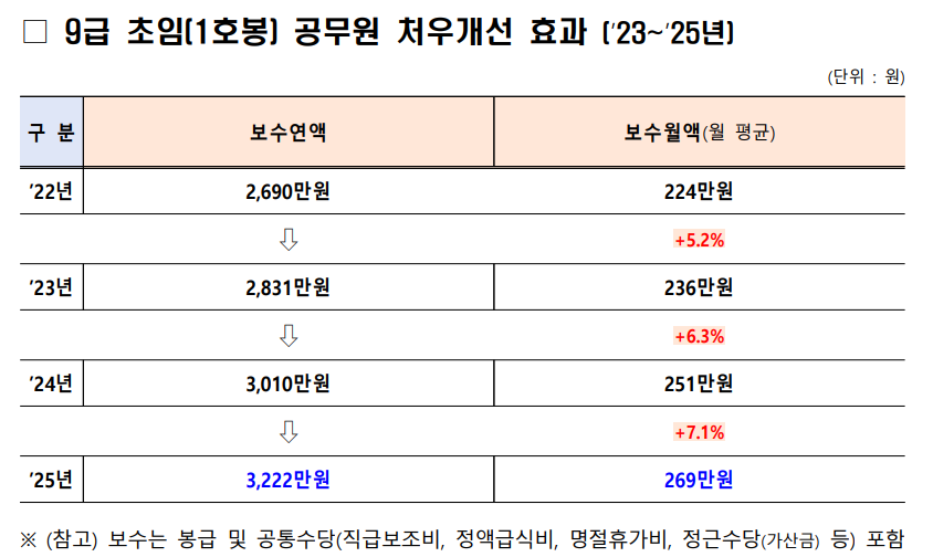 9급 초임의 봉급 인상률은 6.6%로 지정되어 초임 봉급이 처음으로 200만 원을 넘게 됩니다. 아울러 추가 처우 개선을 반영한 2025년 9급 초임 보수는 연 3,222만원 수준으로 2024년 대비 7% 인상될 것으로 전망한다고 하네요. 아울러 저출생 관련 지원 및 자녀 양육 여건까지 개선된다고 합니다.