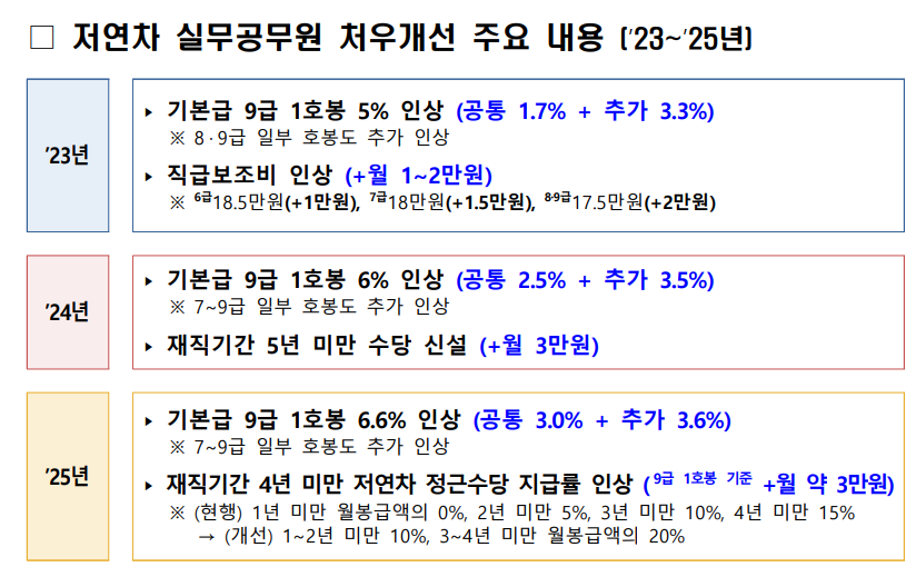 저연차 공무원들은 23년에는 5%인상, 24년에는 6%인상, 25년에는 6.6%가 인상되면서 꾸준한 임금상승을 주고 있습니다. 모두 화이팅입니다.