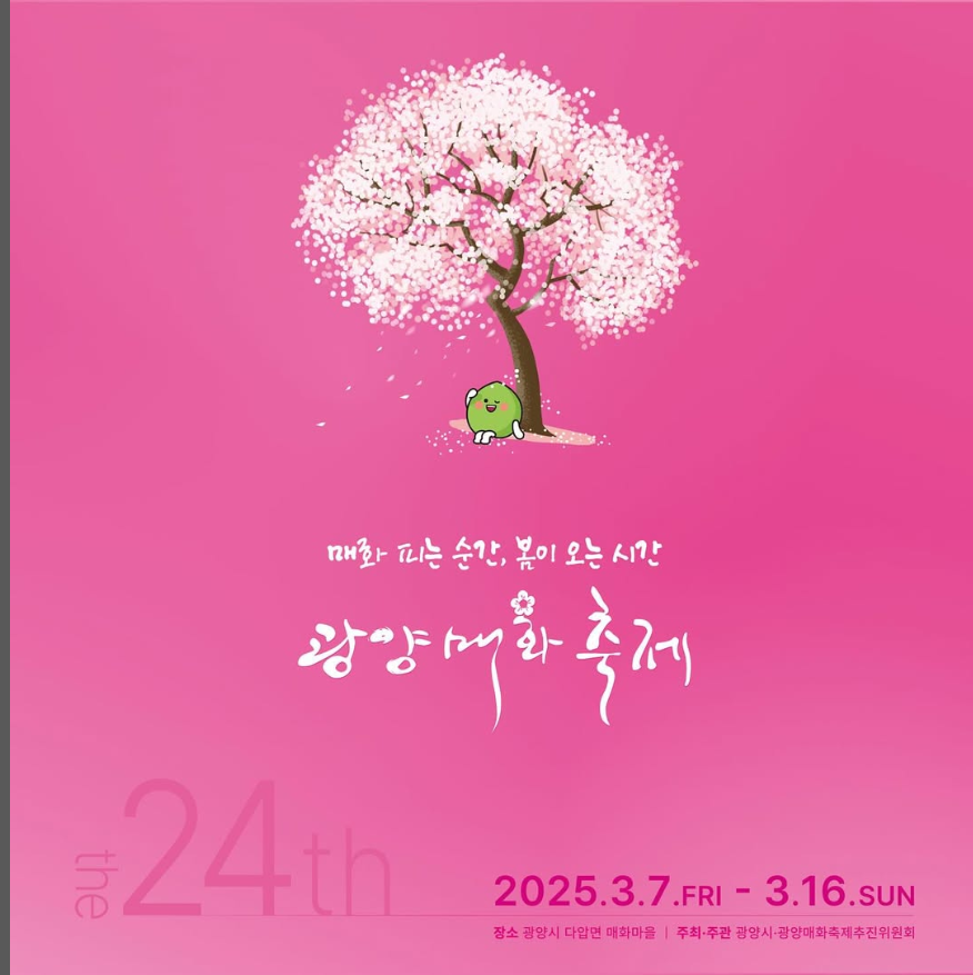 광양매화축제는 봄을 맞이하는 최고의 축제 중 하나로, 아름다운 자연 속에서 다양한 프로그램을 경험할 수 있습니다. 행사장 내 편의시설도 잘 갖춰져 있어 누구나 편안하게 축제를 즐길 수 있습니다. 2025년 봄, 광양에서 특별한 추억을 만들어보세요!