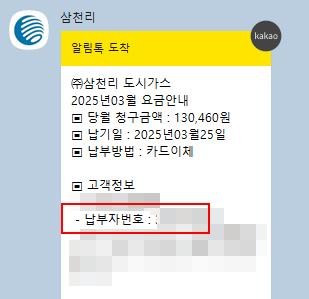 두 번째 방법은 카카오톡 메세지를 보는 방법인데요, 대부분의 도시가스 회사들이 고지서를 카카오톡으로도 보내줍니다. 아래와 같이 오니까 확인해보세요.