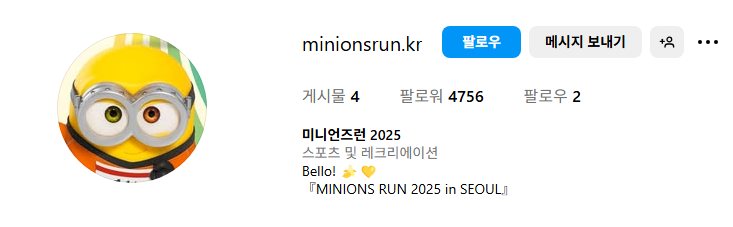신청 관련해서는 아직 세부 공지가 남아 있다고 해요. 예를 들어 참가비, 굿즈 구성, 티셔츠 사이즈 선택 등은 추후 안내 예정이니, 미니언즈런 인스타그램이나 GS25 채널도 꼭 팔로우 해두세요. 아래 인스타그램 프로필 누르면 인스타그램 주소로 이동합니다!