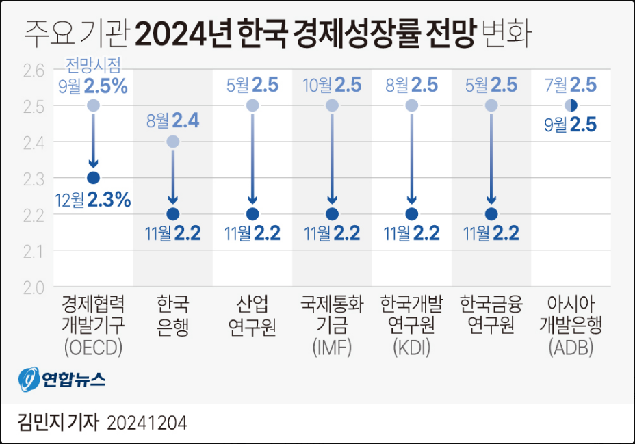 한국의 2024년과 2025년 GDP를 비교하면, 성장률이 너무 낮아서 GDP변화가 거의 없습니다. 게다가 환율 급등으로 인해 원화가치가 하락하여 더 성장하지 못 하는 모습이에요.