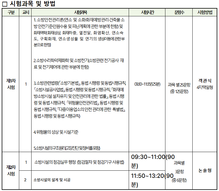 - 1교시: 소방시설 점검실무 행정 (09:30 ~ 11:00, 논술형 3문항)