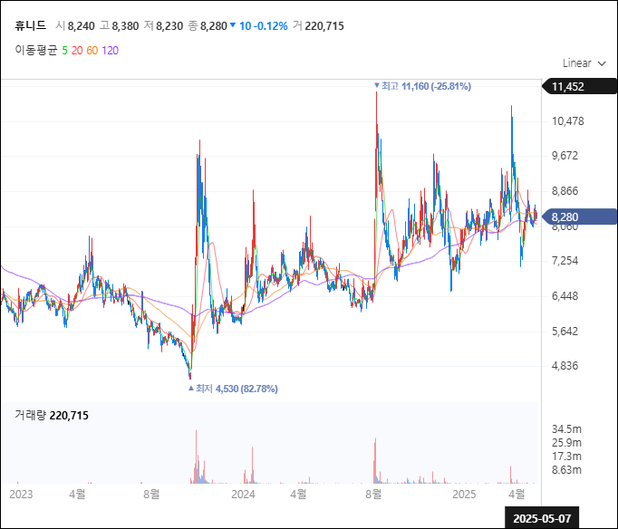 휴니드는 거래량이 몰릴 땐 정말 폭발적으로 움직이는 종목이라, 이슈 때 단기 공략하기 좋은 테마주입니다. 다만, 변동성이 크니 익절 타이밍을 놓치지 않는 게 중요해요. 한화에어로스페이스나 LIG넥스원과는 다르게 단타로 치고 빠져야 하는 잡주입니다. 인도 파키스탄 전쟁이 터지면 잠시 반등할텐데 그 때 먹고 튀어야 합니다.