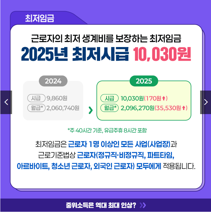최저임금의 경우 시급이 170원 올라 10,030원 이며 월급은 최저 2,096,270원이 되었어요(주 40시간 기준, 유급주휴 8시간 포함). 최저임금은 대한민국 국민 모두에게 포함되며 특히 외국인 근로자도 포함되는 사항이니 모두의 월급이 오른다고 볼수 있겠죠.