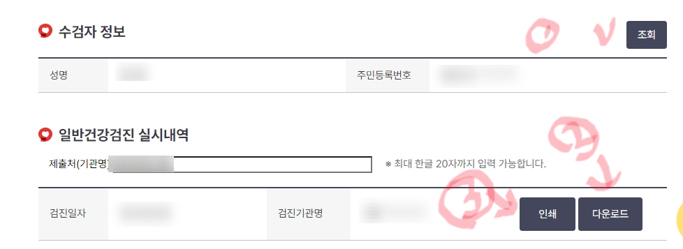 채용 건강검진 대체통보서 메뉴에 들어간 뒤, 조회 버튼을 누르면 수검자정보가 나옵니다. 수검자정보가 조회되면 제출처를 입력하고 인쇄나 다운로드 버튼을 눌러서 진행하면 됩니다. 인쇄를 하고 싶다면 인쇄를, PDF파일로 다운로드를 받고 싶다면 다운로드 버튼을 누르면 됩니다.