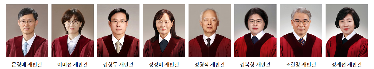 2025년 1월 17일 현재 헌법재판관은 총 8인으로 구성되어 있음. 문형배 재판관, 이미선 재판관, 김형두 재판관, 정정미 재판관, 정혁식 재판관, 김복형 재판관, 조한찬 재판관, 정계선 재판관임. 아래 헌법재판관의 약력은 헌법재판소 공식 홈페이지에서 확인 가능함.