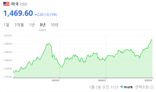 2025년 1월 2일 환율이 내려가지 못하고 여전히 1469원대를 유지하고 있습니다. 고점이었던 1480원대에 비하면 많이 낮아진 수준이지만 여전히 1450원 대 이상을 유지하면서 위험한 신호를 보내고 있죠. 어떤 이들은 2025년에 한국에 경제위기가 닥친다고도 합니다. 진짜 그럴까요? 이번에 제가 직접 분석해봅니다.