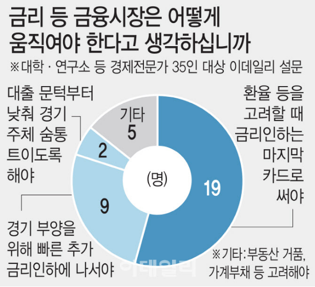 이 있을겁니다. 만약 한국은행이 3번의 이유로 금리를 인하 한다면 부동산 가격을 잡지 못하고 내수 침체는 더 심해지겠죠. 그렇다고 내리지 않으면..? 미국의 금리 인하 속도를 따라가지 못해서 망합니다. 이러지도 저러지도 못하는 상황입니다.
