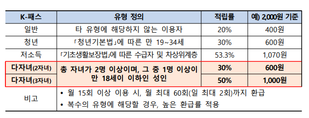 한 마디로 저번달에 10만원을 교통비로 썼다면 다음달에 2자녀 가구는 3만원을 환급받고, 3자녀 가구는 5만원을 환급받을 수 있는 엄청난 혜택입니다. 2자녀 가구는 대중교통을 30% 할인받는 효과를, 3자녀 가구는 50% 환급받는 혜택을 누리는 겁니다.