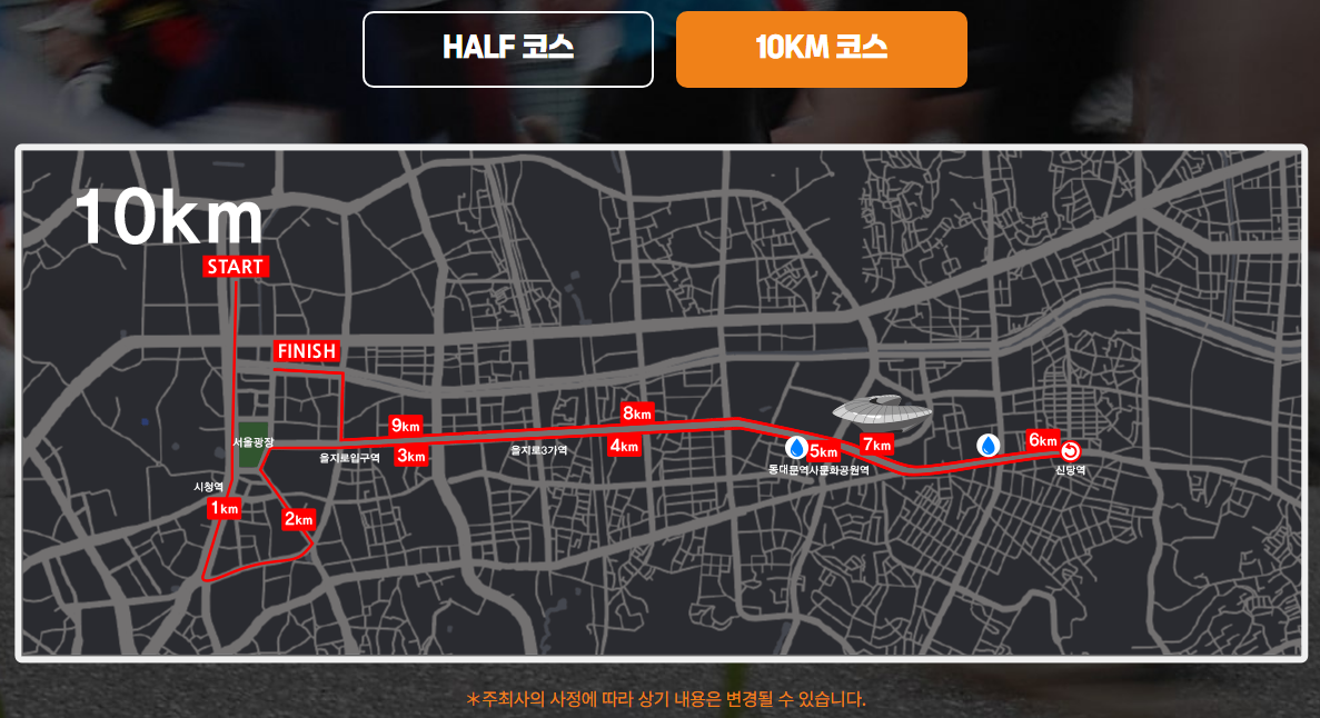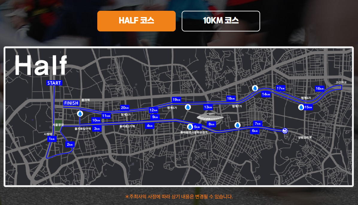 아래는 HALF코스와 10km코스 구간 이미지입니다. 아래 구간을 보시고 화장실이나 물 마시는 구간, 쉴 수 있는 구간 등을 꼭 체크하고 가세요. 초보자분들은 특히 미리 체크하셔야합니다.
