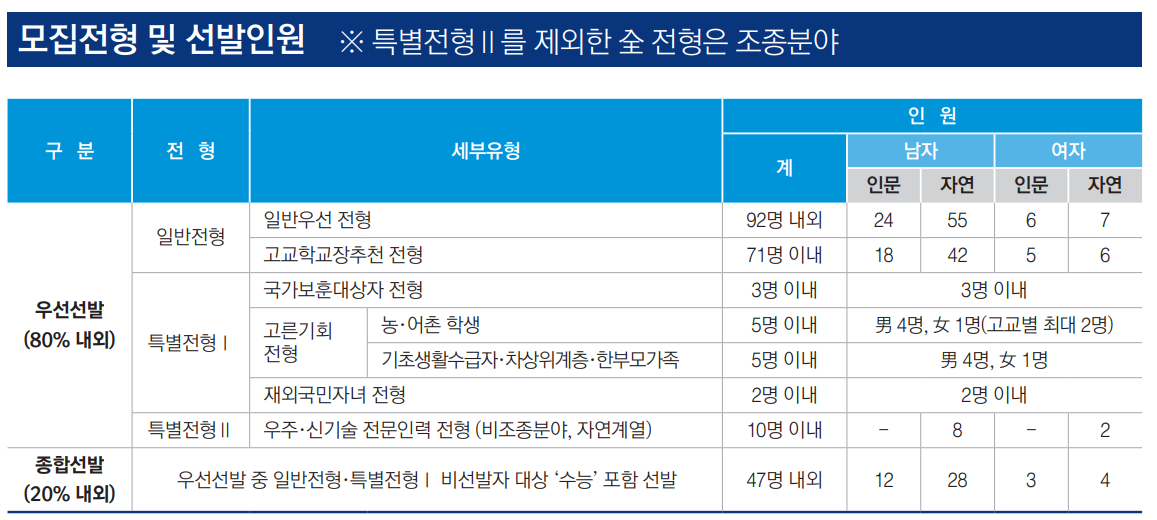 보통 많은 인원이 지원하는 전형은 일반우선전형인데, 학교장추천전형도 노려볼 법 해요. 담임선생님께 말씀드리면 고교학교장추천을 받을 수 있을거에요. 그 외 우주 신기술 전문인력 전형도 있는데 이 부분도 노려볼법 합니다. 이과 학생들이라면 면접에서 승부를 볼 수 있을겁니다.
