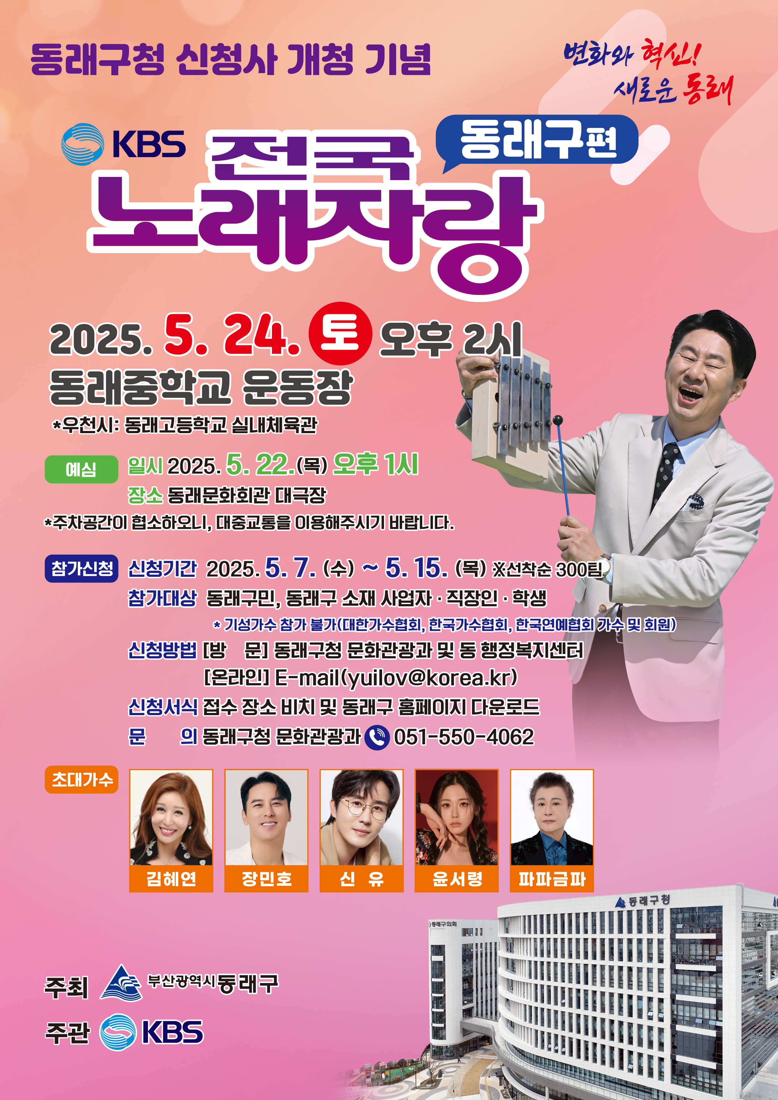2025년 5월 24일에 공개녹화되죠!? 부산광역시 동래구청 신청사 개청을 기념해 열리는 KBS 전국노래자랑 동래구편의 참가신청 방법과 녹화 일정, 초대가수, 장소에 대한 모든 정보를 정리해드릴게요! 자세한 내용 본문에서 바로 시작합니다!