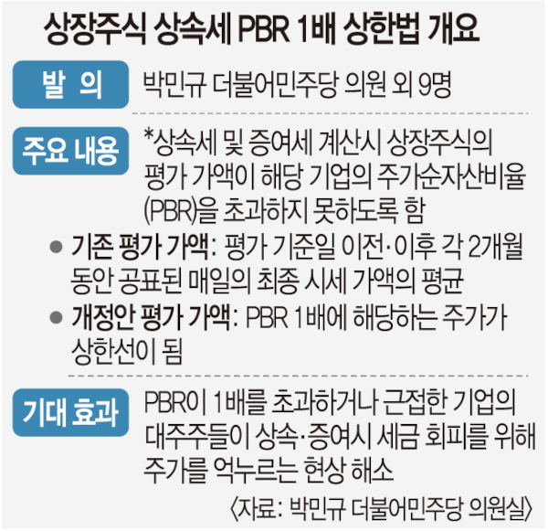 상속세 및 증여세 계산시 상장주식의 평가 가액이 해당 기업의 주가순자산비율을 초과하지 못하도록 함. 기존 평가가액은 평가 기준일 이전과 이후 각 2개월 동안 공표된 매일의 최종 시세 가액의 평균을 따졌는데 개정안이 발의되면 PBR1배에 해당하는 주가가 상한선이 됨.